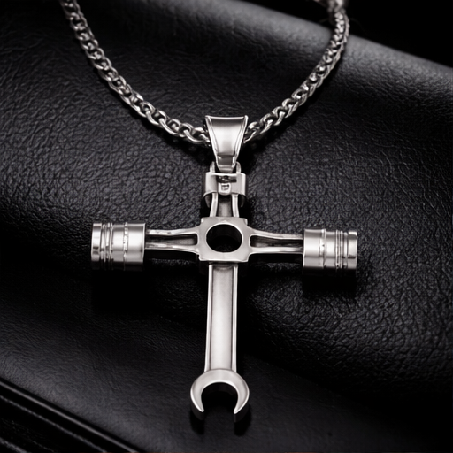 Design: A cross silhouette fusing a piston center, wrench-ended arms, and integrated 10mm socket base. -